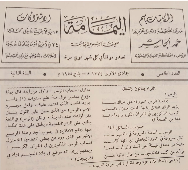 [ وللشيخ حمد الجاسر بحث عن الرس في القرآن نُشر في مجلة العرب في شهر رجب سنة 1390هـ وقد ذكر أن جملة الأقوال أن موقع الرس يطلق على البلاد المعروفة الآن باسم ( الأفلاج ) وكان هذا الرأي معروفاً إلى منتصف القرن الخامس الهجري ] (من كتاب تأريخ الأفلاج وحضارتها للشيخ عبدالله الجذالين ص 115).