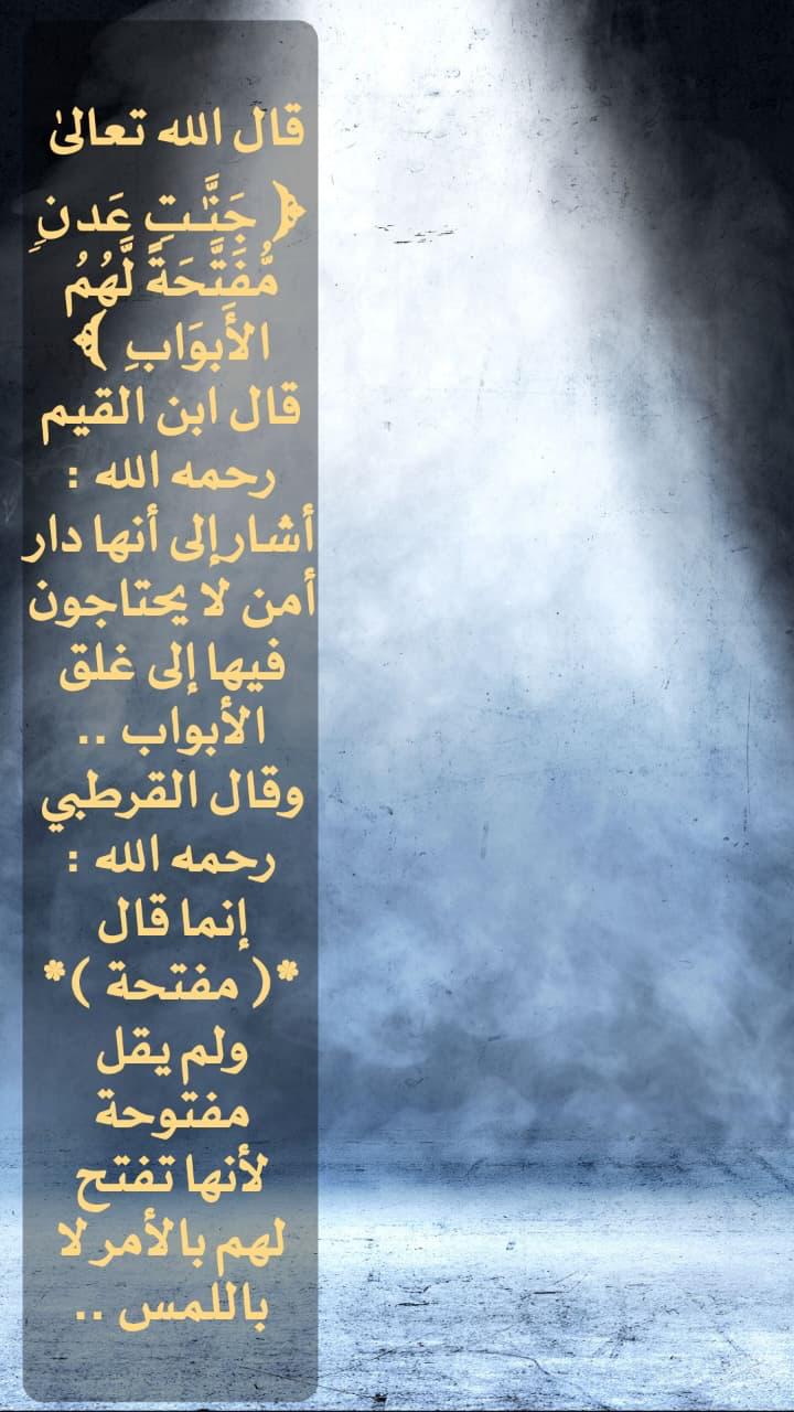 قال الله تعالى: ﴿جَنَّاتِ عَدْنٍ مُّفَتَّحَةً لَّهُمُ الْأَبْوَابُ﴾ •قال ابن القيم رحمه الله: أشار إلى أنها دار أمن لا يحتاجون فيها إلى غلق الأبواب • وقال القرطبي رحمه الله : إنما قال: "مفتحة" ولم يقل مفتوحة لأنها تفتح لهم بالأمر لا باللمس.