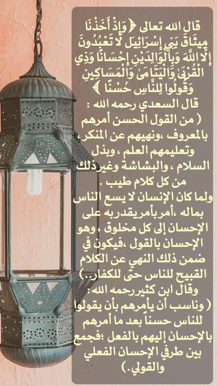 قال الله تعالى: ﴿وَإِذْ أَخَذْنَا ميثَاقَ بَنِي إِسْرَائِيلَ لَّا تَعْبُدُونَ إِلَّا اللَّهَ وَبِالْوَالِدَيْنِ إِحْسَانًا وَذِي الْقُرْبَى وَالْيَتَامَى وَالْمَسَاكِينِ وَقُولُوا لِلنَّاسِ حُسْنًا﴾ ... المزيد