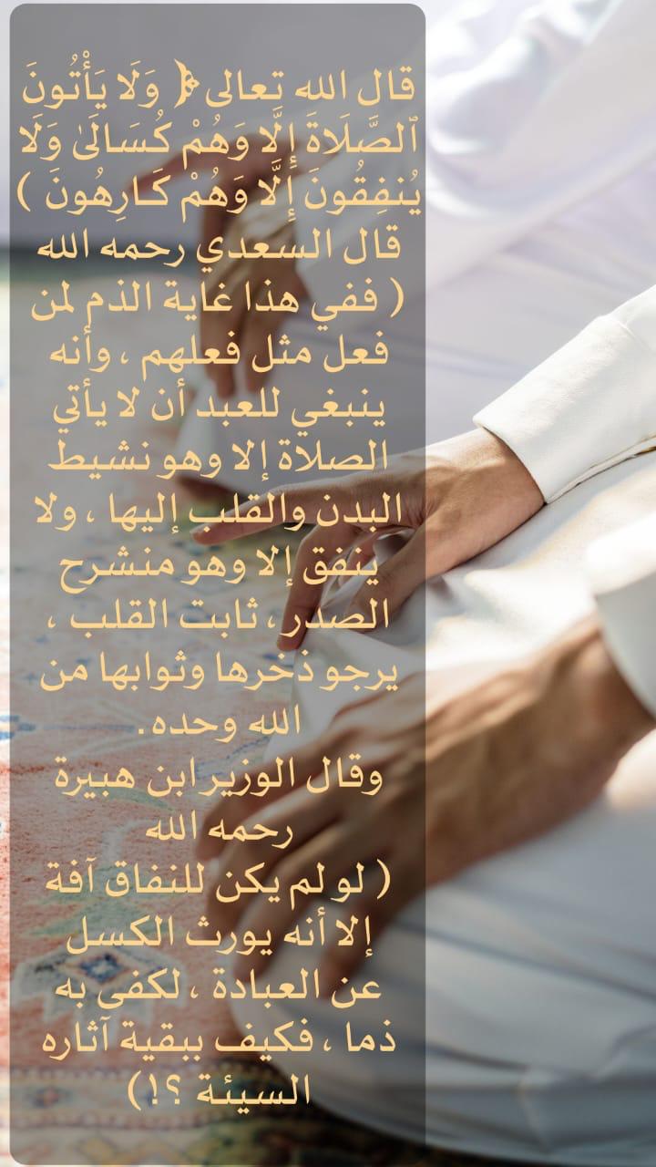 قال الله تعالى: ﴿وَلَا يَأْتُونَ الصَّلَاةَ إِلَّا وَهُمْ كُسَالَى وَلَا يُنفِقُونَ إِلَّا وَهُمْ كَارِهُونَ﴾ • قال السعدي رحمه الله ( ففي هذا غاية الذم لمن فعل مثل فعلهم ، وأنه ينبغي للعبد أن لا يأ... المزيد