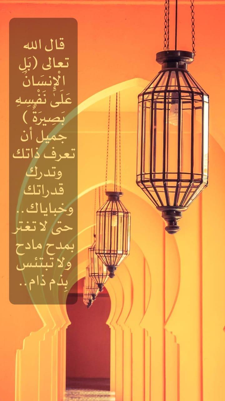 قال الله تعالى: ﴿بَلِ الْإِنسَانُ عَلَى نَفْسِهِ بَصِيرَةٌ﴾ • جميل أن تعرف ذاتك وتدرك قدراتك وخباياك ... حتى لا تغتر بمدح مادح ولا تبتئس بِذم ذامّ ..
