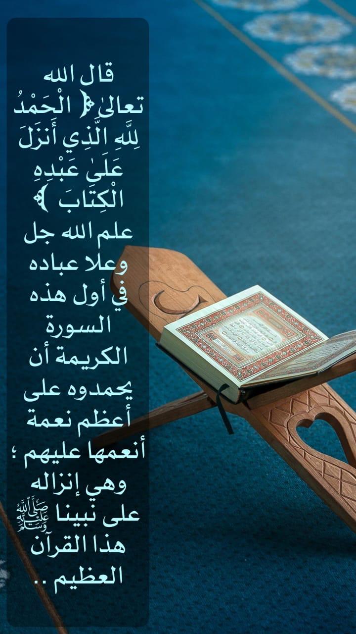 قال الله تعالى: ﴿الْحَمْدُ لِلَّهِ الَّذِي أَنزَلَ عَلَى عَبْدِهِ الْكِتَابَ وَلَمْ يَجْعَل لَّهُ عِوَجَا﴾ علّم الله جل وعلا عباده في أول هذه السورة الكريمة أن يحمدوه على أعظم نعمة أنعمها عليهم ؛ وهي إنزاله على نبينا ﷺ هذا القرآن العظيم.