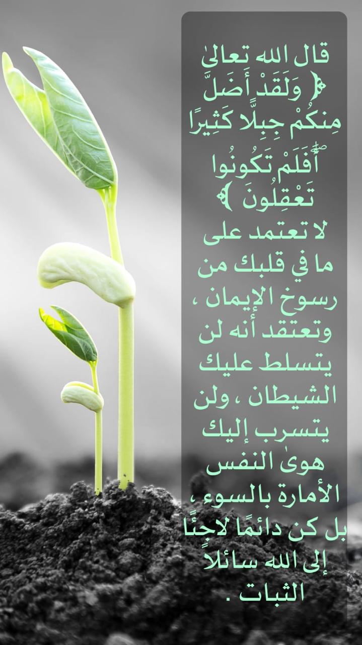 قال الله تعالى: ﴿وَلَقَدْ أَضَلَّ مِنكُمْ جِبِلًّا كَثِيرًا أَفَلَمْ تَكُونُوا تَعْقِلُونَ﴾ • لا تعتمد على ما في قلبك من رسوخ الإيمان ، وتعتقد أنه لن يتسلط عليك الشيطان ، ولن يتسرب إليك هوى النفس الأمارة بالسوء ، بل كن دائما لاجئا إلى الله سائلا الثبات.