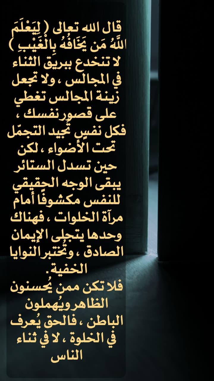 قال الله تعالى: ﴿لِيَعْلَمَ اللَّهُ مَن يَخَافُهُ بِالْغَيْبِ﴾ • لا تنخدع ببريق الثناء في المجالس ، ولا تجعل زينة المجالس تغطي على قصور نفسك ، فكل نفس تجيد التجمل تحت الأضواء ، لكن حين تسدل الستائر ي... المزيد