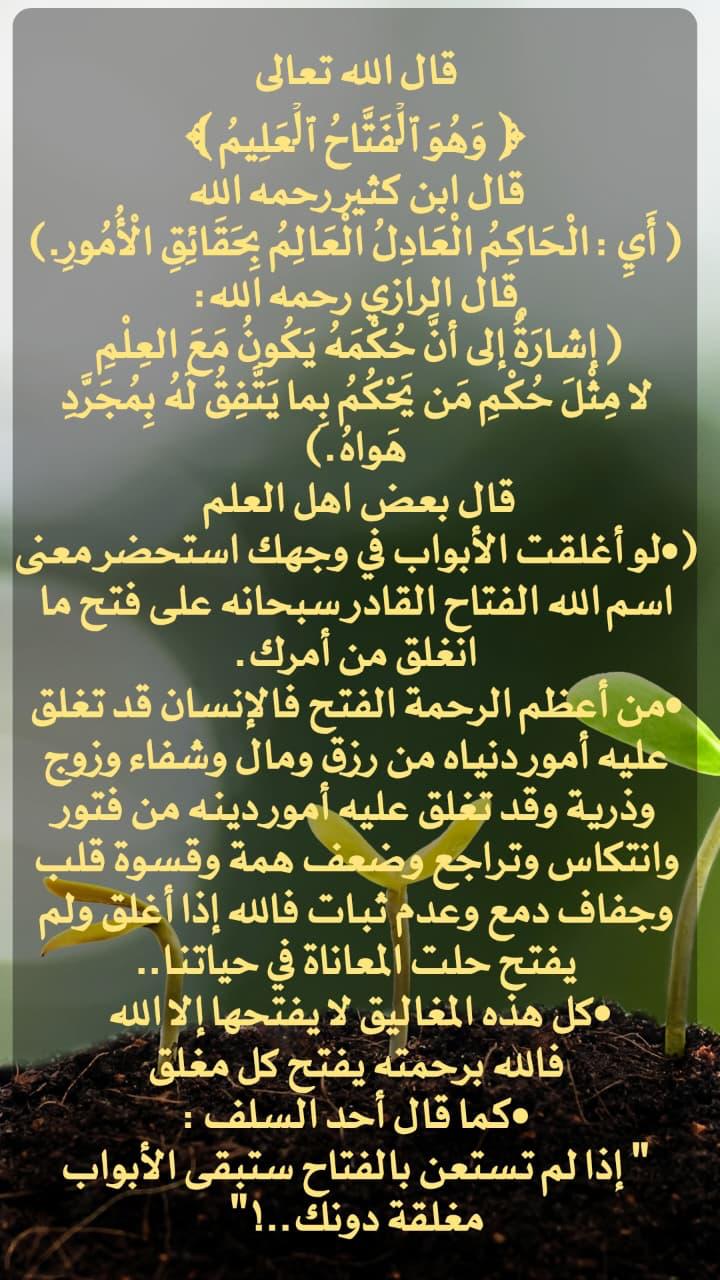 قال الله تعالى: ﴿وَهُوَ الْفَتَّاحُ الْعَلِيمُ﴾ • قال ابن كثير رحمه الله: ( أَي : الْحَاكِمُ الْعَادِلُ الْعَالِمُ بِحَقَائِقِ الْأُمُورِ.) • قال الرازي رحمه الله : ( إشارة إلى أَنَّ حُكْمَهُ يَك... المزيد