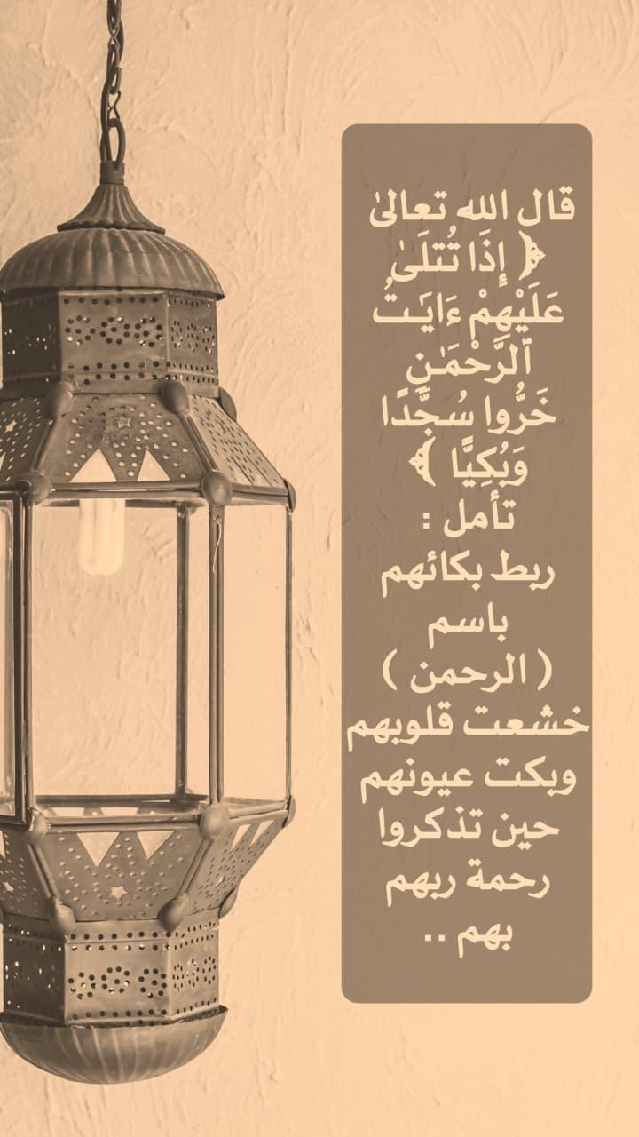 قال الله تعالى: إِذَا تُتْلَى عَلَيْهِمْ آيَاتُ الرَّحْمَنِ خَرُّوا سُجَّدًا وَبُكِيًّا﴾ • تأمل : ربط بكائهم باسم ( الرحمن ) خشعت قلوبهم وبكت عيونهم حين تذكروا رحمة ربهم بهم.