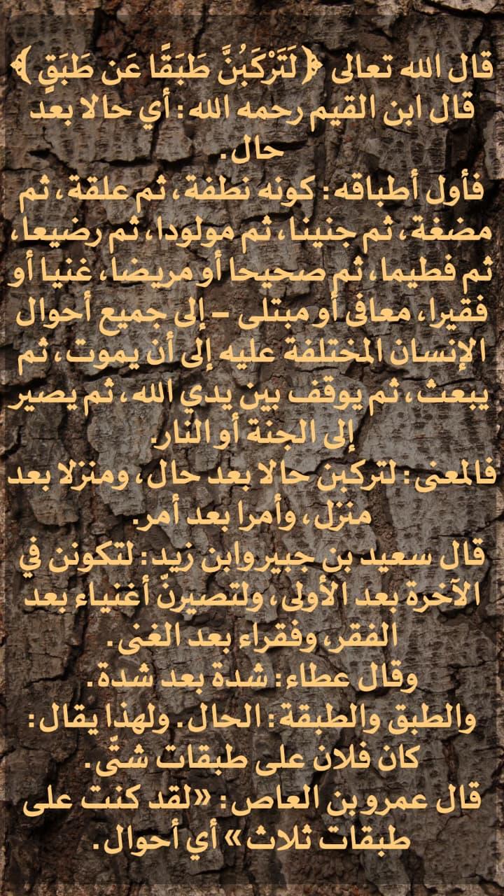 قال الله تعالى: ﴿لَتَرْكَبُنَّ طَبَقًا عَن طَبَقٍ﴾ • قال ابن القيم رحمه الله: أي حالا بعد حال فأول أطباقه: كونه نطفة، ثم علقة، ثم مضغة، ثم جنينا، ثم مولودا، ثم رضيعا، ثم فطيما، ثم صحيحا، أو مريضا،... المزيد