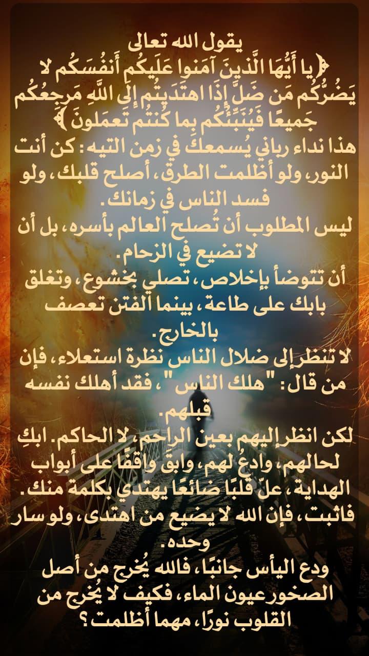 يقول الله تعالى: ﴿يَا أَيُّهَا الَّذِينَ آمَنُوا عَلَيْكُمْ أَنفُسَكُمْ لَا يَضُرُّكُم مَّن ضَلَّ إِذَا اهْتَدَيْتُمْ إِلَى اللَّهِ مَرْجِعُكُمْ جَمِيعًا فَيُنَبِّئُكُم بِمَا كَنتُمْ تَعْمَلُونَ﴾ • ... المزيد