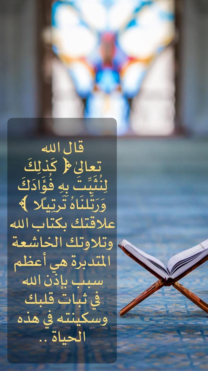 قال الله تعالى: ﴿كَذَلِكَ لِنُثَبِّتَ بِهِ فُؤَادَكَ وَرَتَّلْنَاهُ تَرْتِيلًا﴾ • علاقتك بكتاب الله وتلاوتك الخاشعة المتدبرة هي أعظم سبب بإذن الله في ثبات قلبك وسكينته في هذه الحياة.