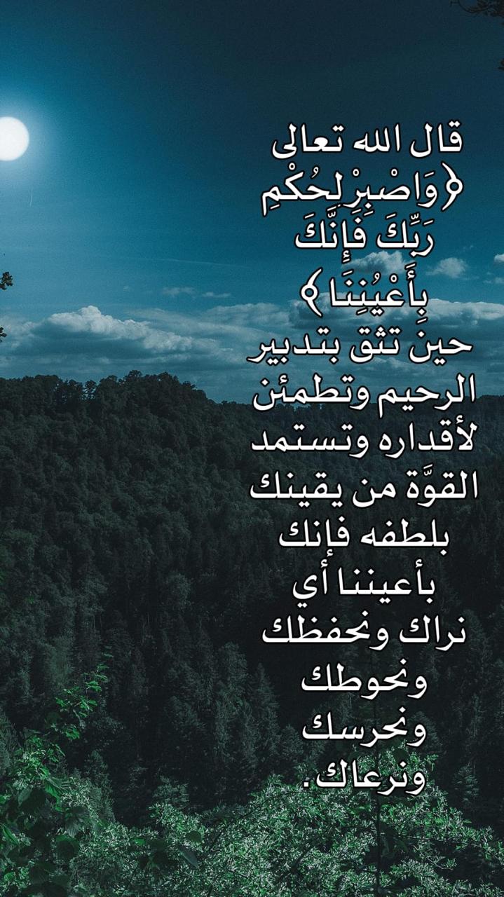 قال الله تعالى: ﴿وَاصْبِرْ لِحُكْمِ رَبِّكَ فَإِنَّكَ بِأَعْيُنِنَا﴾ • حين تثق بتدبير الرحيم وتطمئن لأقداره وتستمد القوة من يقينك بلطفه فإنك بأعيننا أي نراك ونحفظك ونحوطك ونحرسك ونرعاك.