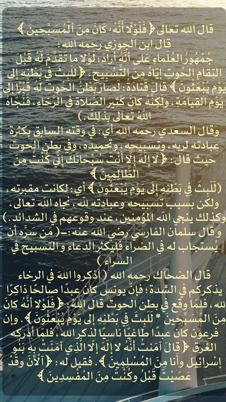 قال الله تعالى: ﴿فَلَوْلَا أَنَّهُ كَانَ مِنَ الْمُسَبِّحِينَ﴾ • قال ابن الجوزي رحمه الله : جمهور العلماء على أنه أراد : لولا ما تقدم له قبل التقام الحوتِ إِيَّاهُ مِنَ التسبيح ﴿لَلَبِثَ فِي بَطْنِهِ... المزيد