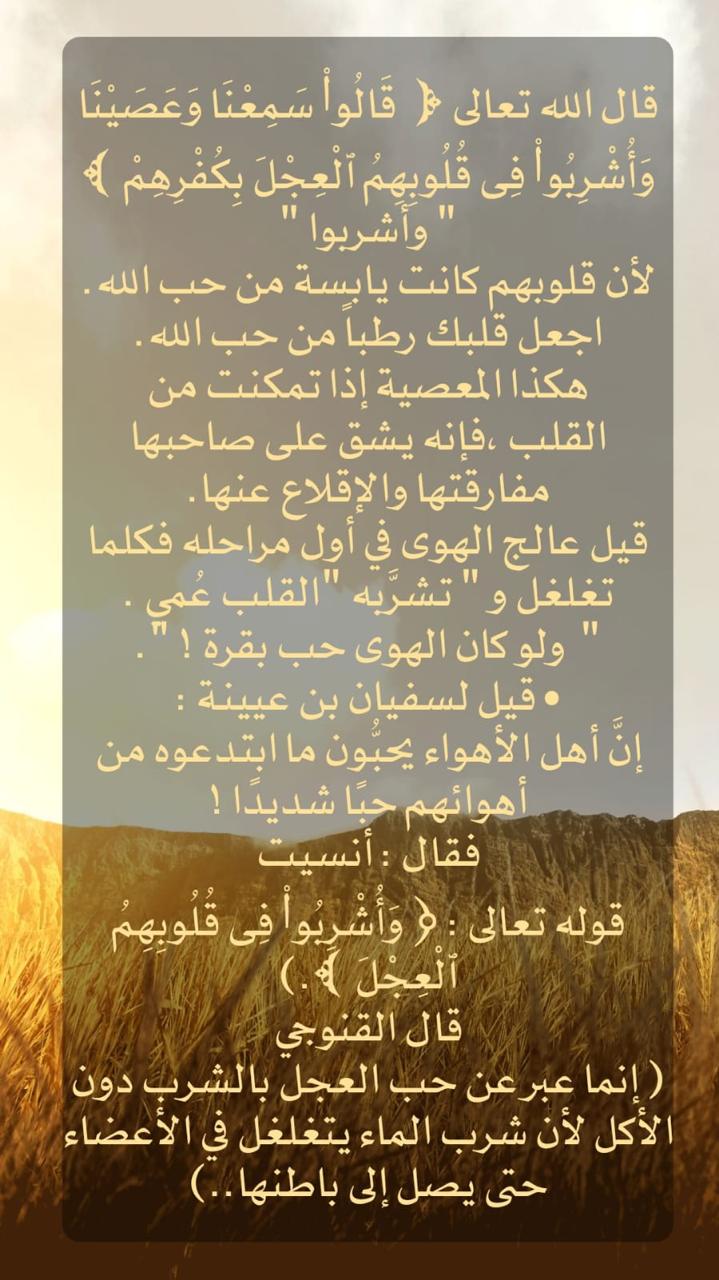 قال الله تعالى: ﴿قَالُوا سَمِعْنَا وَعَصَيْنَا وَأُشْرِبُوا فِي قُلُوبِهِمُ الْعِجْلَ بِكُفْرِهِمْ﴾ "وأشربوا" لأن قلوبهم كانت يابسة من حب الله. • اجعل قلبك رطبا من حب الله . هكذا المعصية إذا تمكن... المزيد