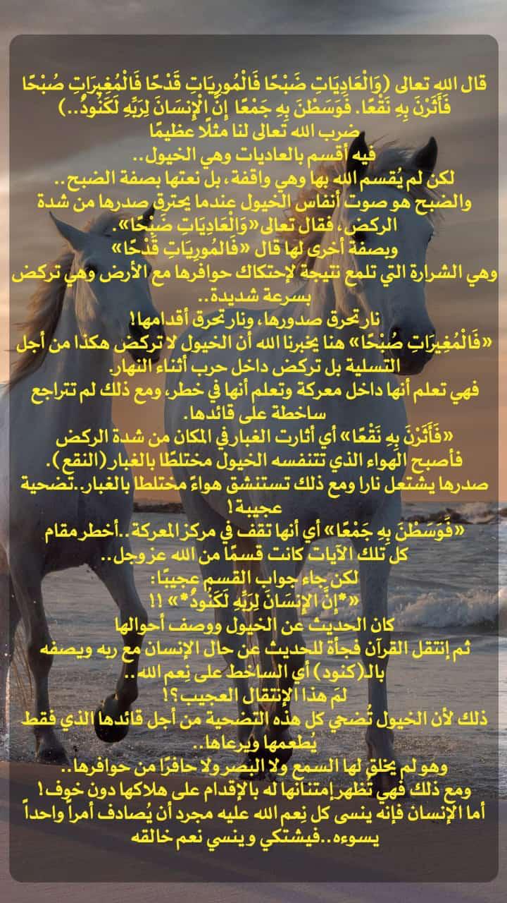 ﴿وَالْعَادِيَاتِ ضَبْحًا (١) فَالْمُورِيَاتِ قَدْحًا (٢) فَالْمُغِيرَاتِ صُبْحًا (٣) فَأَثَرْنَ بِهِ نَقْعًا (٤) فَوَسَطْنَ بِهِ جَمْعًا (٥) إِنَّ الْإِنسَانَ لِرَبِّهِ لَكَنُودٌ(٦)﴾