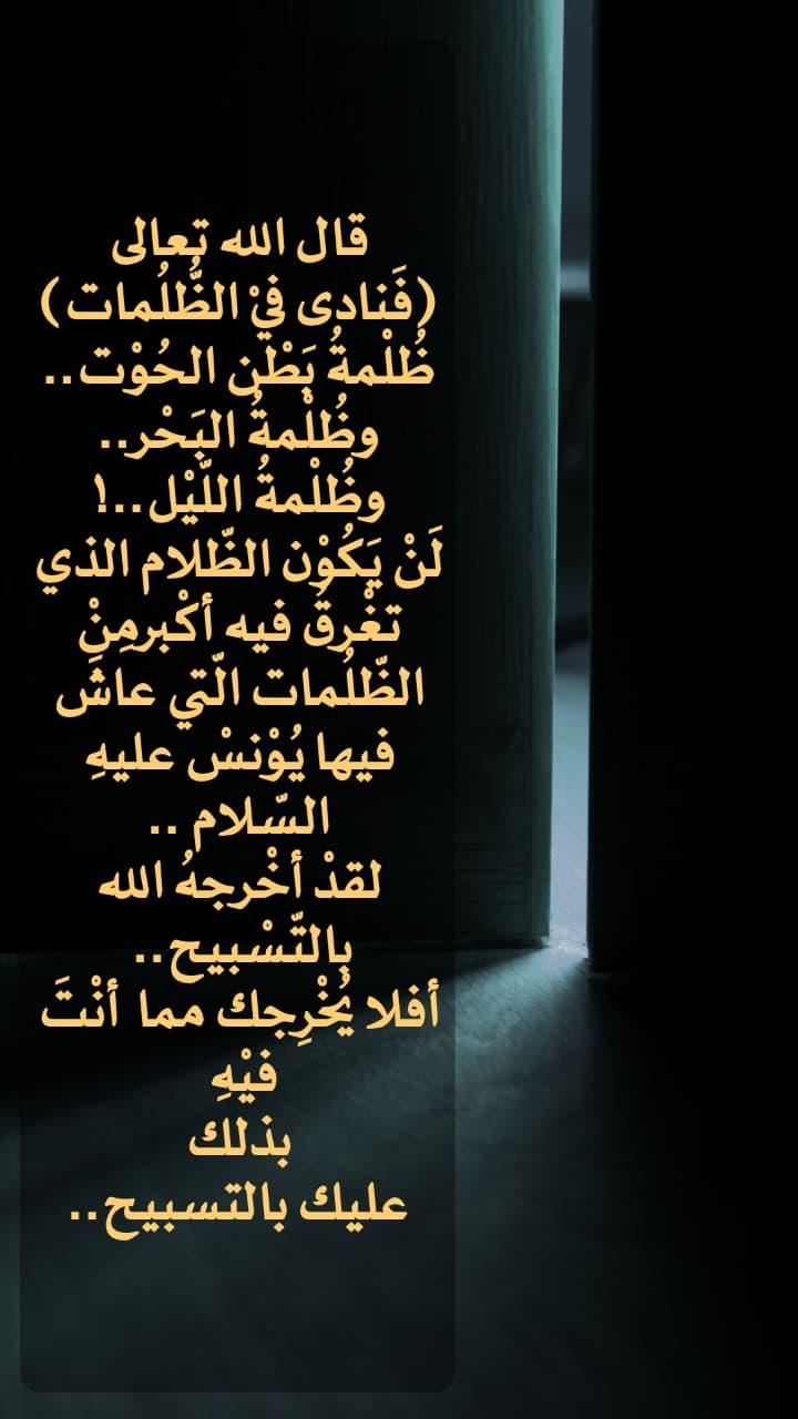 لَنْ يَكُون الظلام الذي تغرق فيه أكبر من الظلمات التي عاش فيها يونس عليه السلام، لقد أخرجه الله بالتسبيح .. أفلا يُخرجك مما أنْتَ فيه! لذلك عليك بالتسبيح.