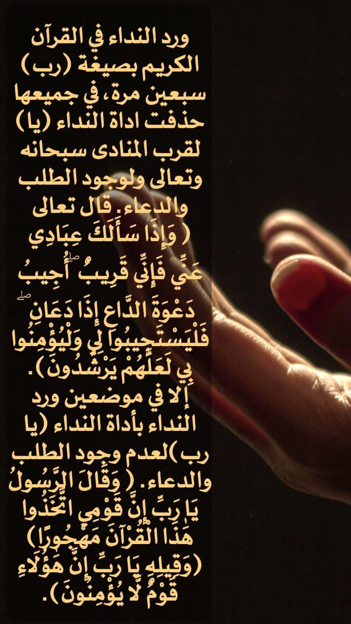 • ورد النداء في القرآن الكريم بصيغة (رب) سبعين مرة، في جميعها حذفت أداة النداء (يا) لقرب المنادَى سبحانه وتعالى ولوجود الطلب والدعاء.