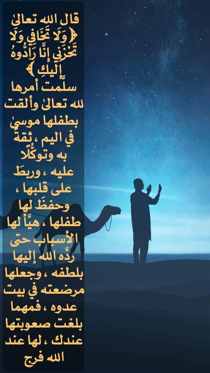 • سلمت أمرها لله تعالى وألقت بطفلها موسي في اليم ، ثقة به وتوكلا عليه ، وربط على قلبها ، وحفظ لها طفلها ، هيأ لها الأسباب حتى رده الله إليها بلطفه ، وجعلها مرضعته في بيت عدوه ، فمهما بلغت صعوبتها عندك ، لها عند الله فرج.