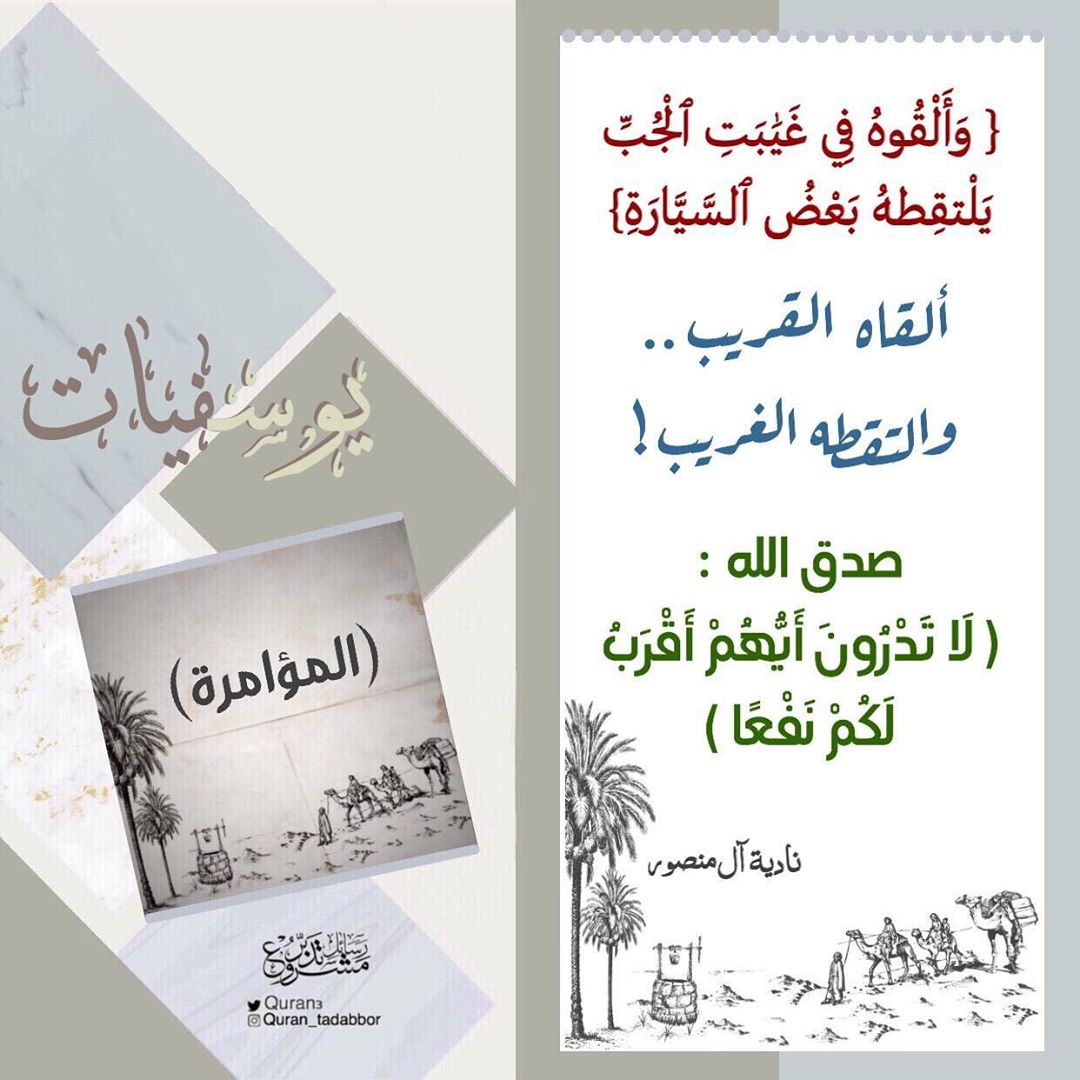 (وَأَلْقُوهُ فِي غَيَابَتِ الْجُبِّ يَلْتَقِطْهُ بَعْضُ السَّيَّارَةِ) ألقاه القريب.. والتقطه الغريب! صدق الله ( لَا تَدْرُونَ أَيُّهُمْ أَقْرَبُ لَكُمْ نَفْعًا)