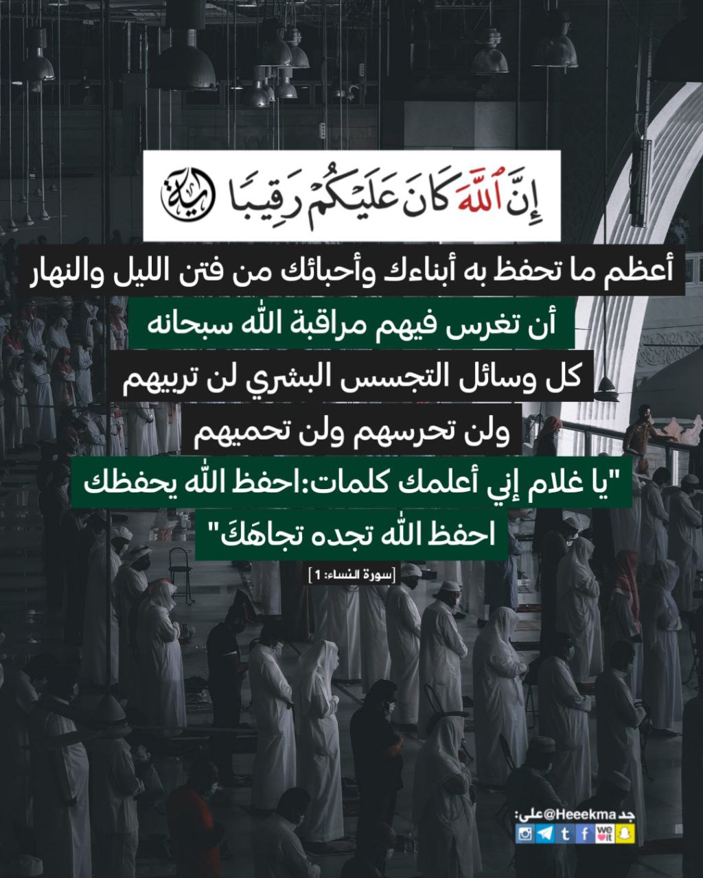 أعظم ما تحفظ به أبناءك وأحبائك من فتن الليل والنهار أن تغرس فيهم مراقبة الله كل وسائل التجسس البشري لن تربيهم ولن تحرسهم ولن تحميهم .. "يا غلام إني أعلمك كلمات: احفظ الله يحفظك احفظ اللَّه تجده تجاهَكَ".