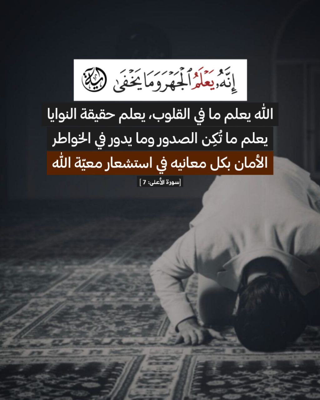 الله يعلم ما في القلوب .. يعلم حقيقة النوايا .. يعلم ما تُكِن الصدور وما يدور في الخواطر .. الأمان بكل معانيه في استشعار معيّة الله.