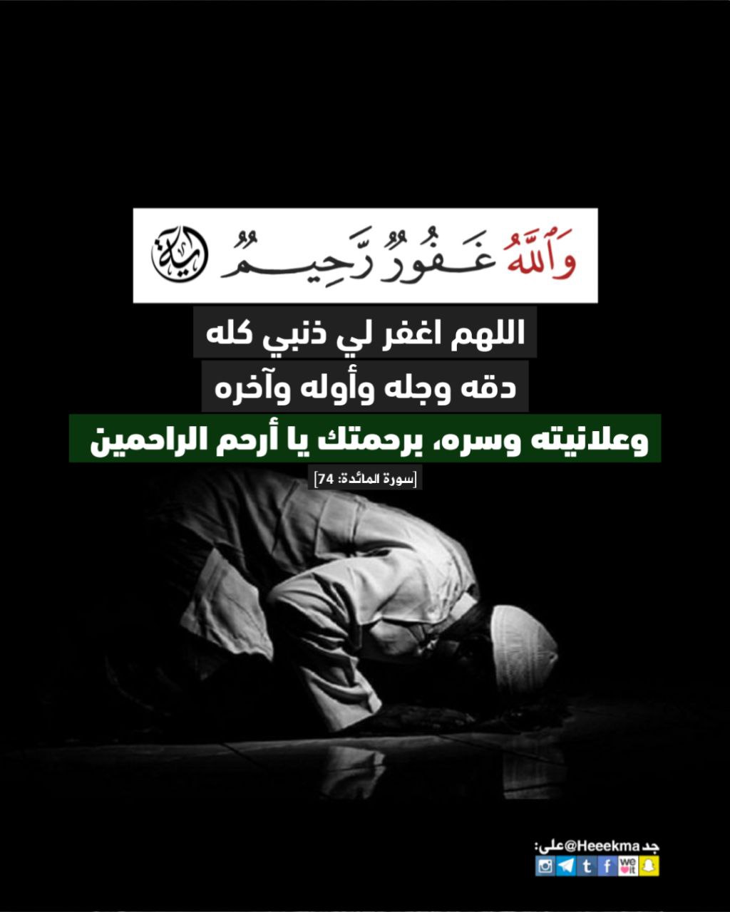 اللهم اغفر لي ذنبي كله، دقه وجلّه، وأوله وآخره، وعلانيته وسره، برحمتك يا أرحم الراحمين.