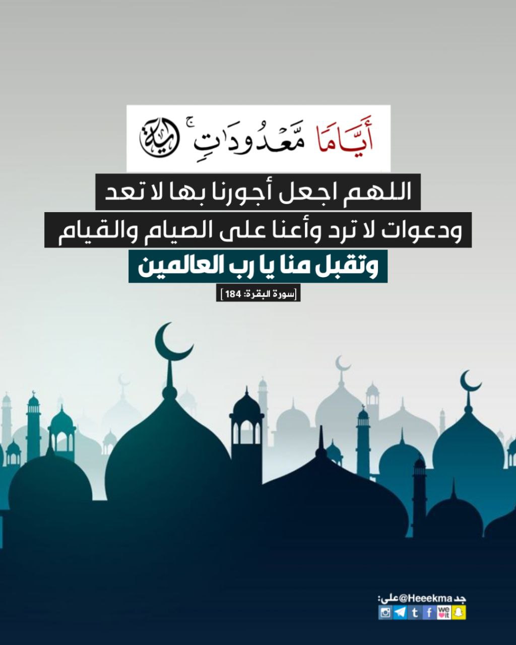 اللّٰهُمَّ اجعل اجورنا بها لا تُعد، ودعواتٍ لا تُرد، واعنا على الصيام والقيام، وتقبل منا يا رب العالمين.