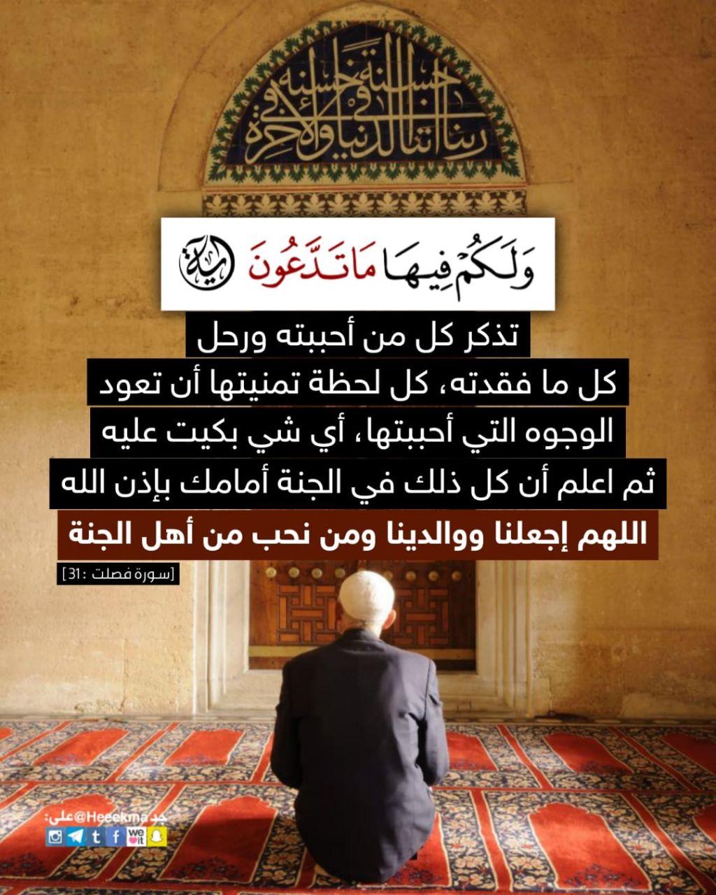 تذكر كل من أحببته ورحل، كل ما فقدته، كل لحظة تمنيتها أن تعود، الوجوه التي أحببتها، أي شي بكيت عليه، ثم اعلم أن كل ذلك في الجنة أمامك بإذن الله .. اللهم اجعلنا ووالدينا ومن نحب من أهل الجنة.