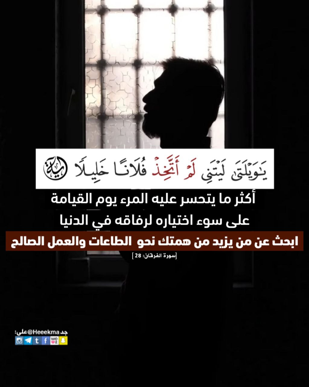 أكثر ما يتحسر عليه المرء يوم القيامة على سوء اختياره لرفاقه في الدنيا .. ابحث عن من يزيد من همتك نحو الطاعات والعمل الصالح.