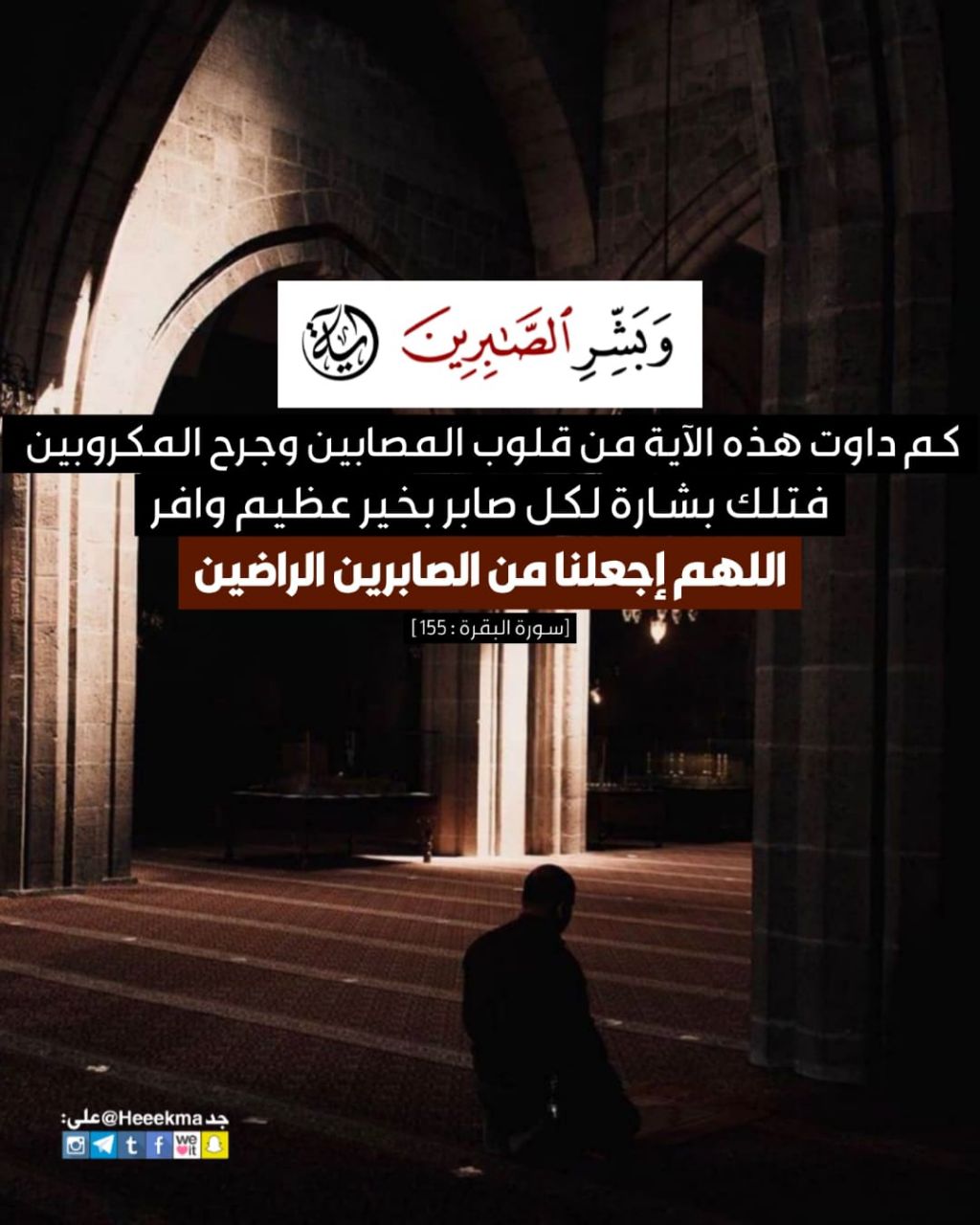 كم داوت هذه الآية من قلوب المصابين وجرح المكروبين .. فتلك بشارة لكل صابر بخير عظيم وافر، اللهم اجعلنا من الصابرين الراضين.