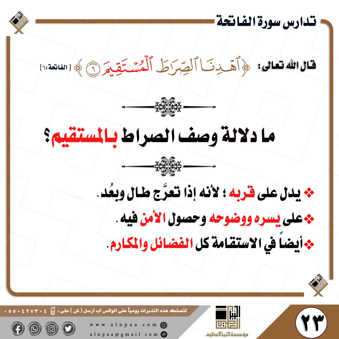 • التساؤل: ﴿اهْدِنَا الصِّرَاطَ الْمُسْتَقِيمَ﴾ ما دلالة وصف الصراط بالمستقيم؟