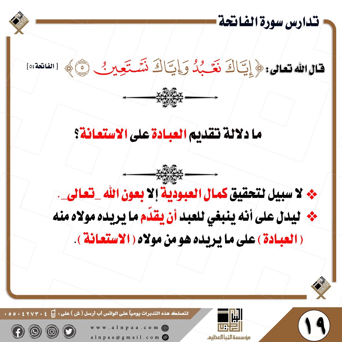 • التساؤل: قال تعالى: ﴿إِيَّاكَ نَعْبُدُ وَإِيَّاكَ نَسْتَعِينُ﴾ ما سر الجمع بين العبادة والاستعانة؟