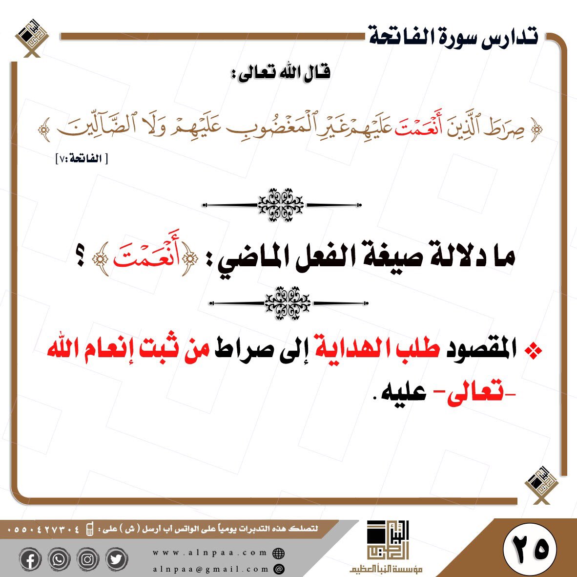 • التساؤل: قال تعالى: ﴿صِرَاطَ الَّذِينَ أَنْعَمْتَ عَلَيْهِمْ غَيْرِ الْمَغْضُوبِ عَلَيْهِمْ وَلَا الضَّالِّينَ﴾ ما دلالة صيغة الفعل الماضي: (أَنْعَمْتَ)؟