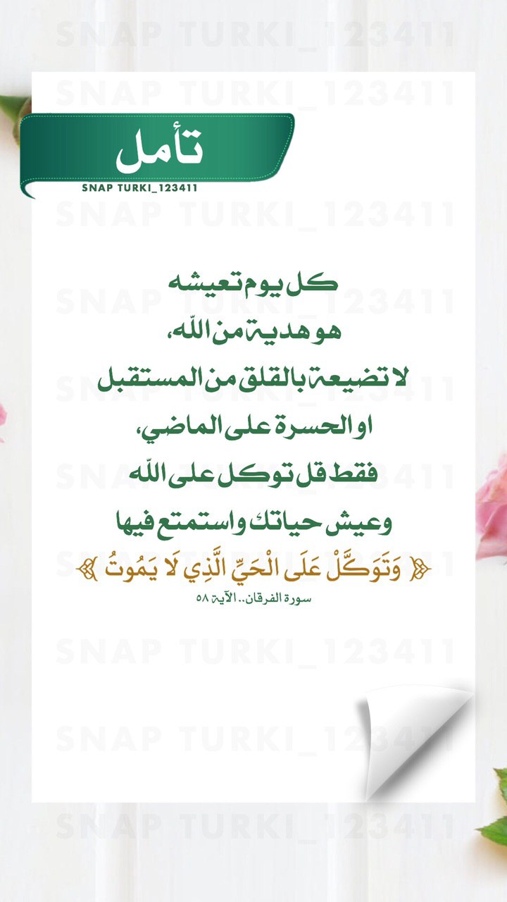 كل يوم تعيشه هو هدية من الله، لا تضيعة بالقلق من المستقبل أو الحسرة على الماضي، فقط قل توكل على الله وعيش حياتك واستمتع فيها.
