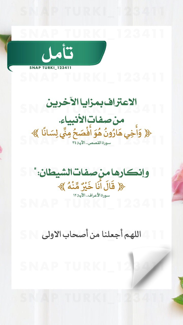 الاعتراف بمزايا الآخرين من صفات الأنبياء ﴿وَأَخِي هَارُونُ هُوَ أَفْصَحُ مِنِّي لِسَانًا﴾ [القصص؛ آية: ٣٤].