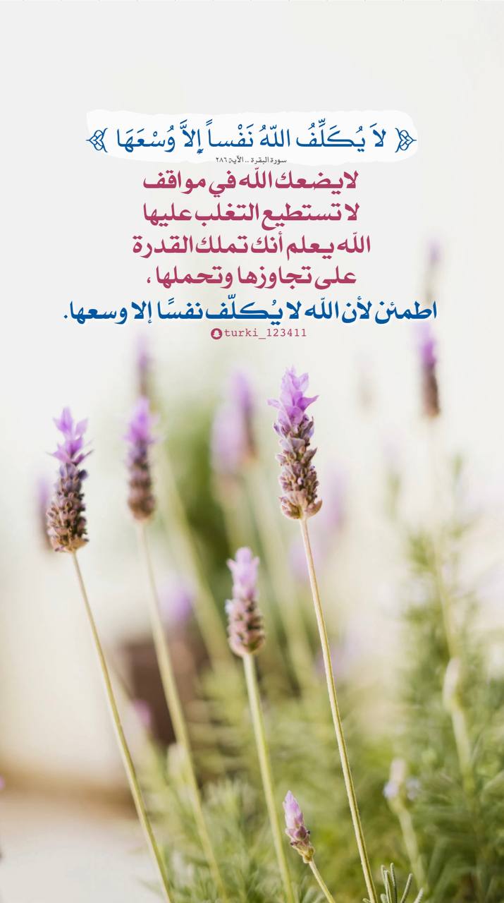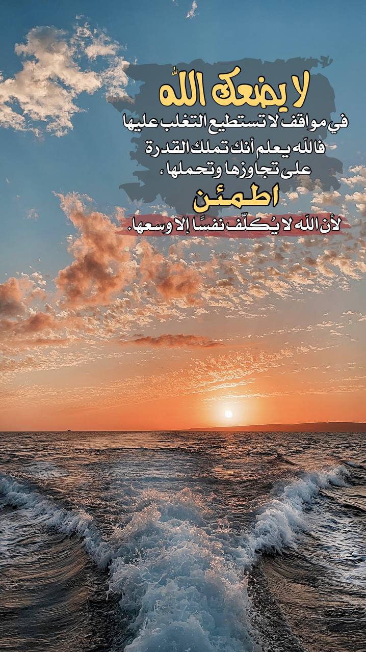 لا يضعك الله في مواقف لا تستطيع التغلب عليها؛ الله يعلم أنك تملك القدرة على تجاوزها وتحملها .. اطمئن لأن الله لا يُكلّف نفسًا إلا وسعها.