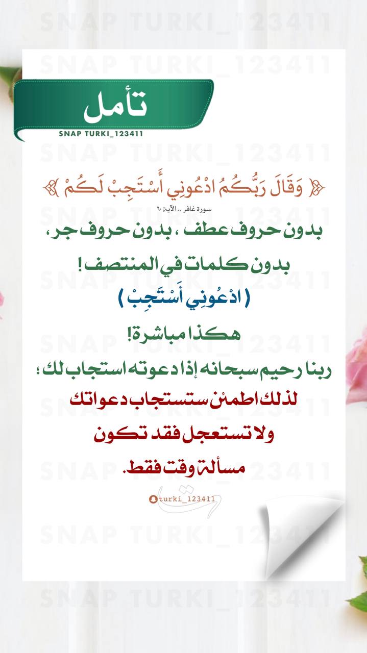 بدون حروف عطف، بدون حروف جر، بدون كلمات في المنتصف! (ادْعُونِي أَسْتَجِبْ) هكذا مباشرة! ربنا رحيم سبحانه إذا دعوته استجاب لك؛ لذلك اطمئن ستستجاب دعواتك ولا تستعجل فقد تكون مسألة وقت فقط.