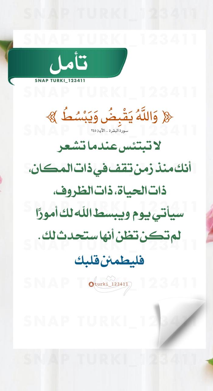 لا تبتئس عندما تشعر أنك منذ زمن تقف في ذات المكان، ذات الحياة، ذات الظروف، سيأتي يوم ويبسط الله لك أموراً لم تكن تظن أنها ستحدث لك .. فليطمئن قلبك.