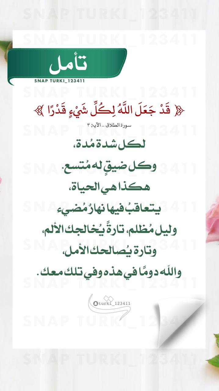 لكل شدة مُدة، وكل ضيق له مُتسع. هكذا هي الحياة، يتعاقبُ فيها نهارٌ مُضيء وليل مُظلم، تارةً يُخالجك الألم، وتارة يُصالحك الأمل، والله دومًا في هذه وفي تلك معك.