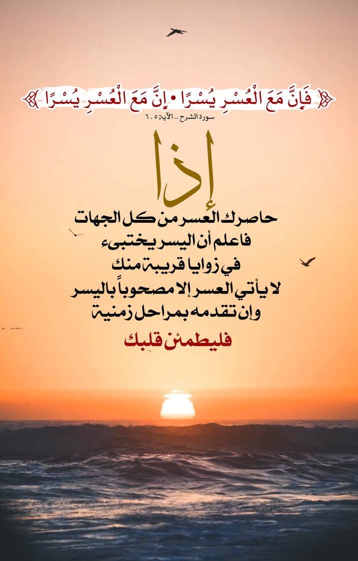 إذا حاصرك العسر من كل الجهات فاعلم أن اليسر يختبيء في زوايا قريبة منك .. لا يأتي العسر إلا مصحوباً باليسر وإن تقدمه بمراحل زمنية .. فليطمئن قلبك.
