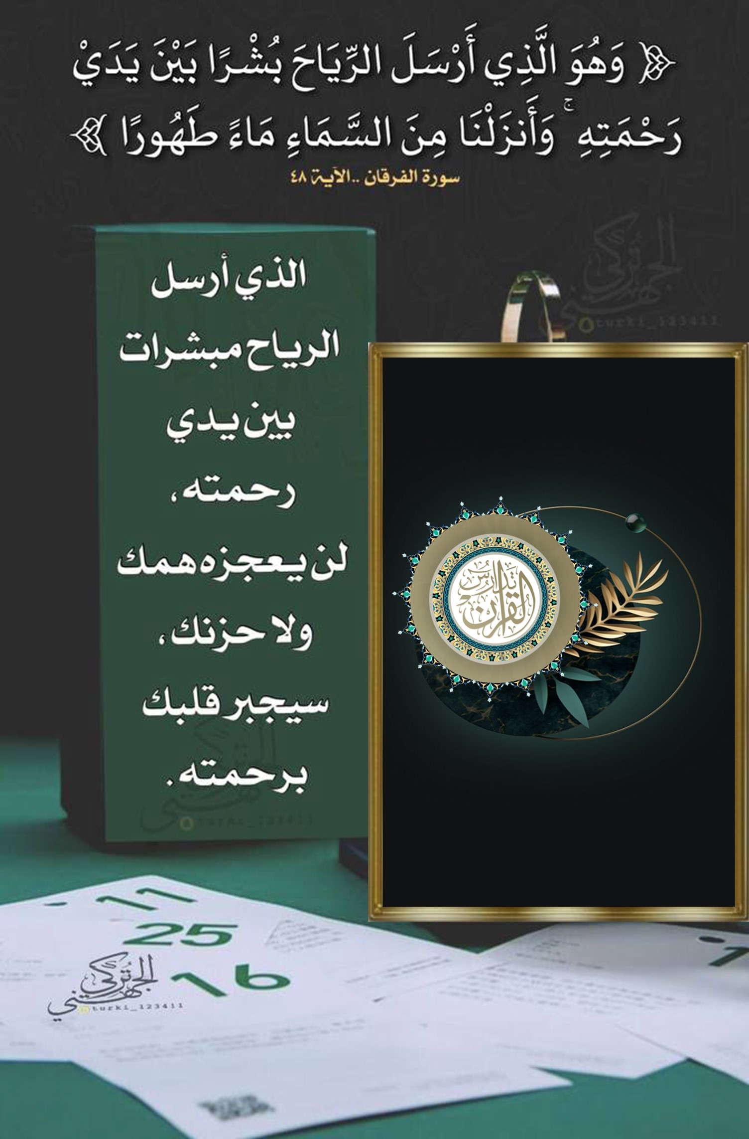 ﴿وَهُوَ الَّذِي أَرْسَلَ الرِّيَاحَ بُشْرًا بَيْنَ يَدَيْ رَحْمَتِهِ وَأَنزَلْنَا مِنَ السَّمَاءِ مَاءً طَهُورًا﴾: