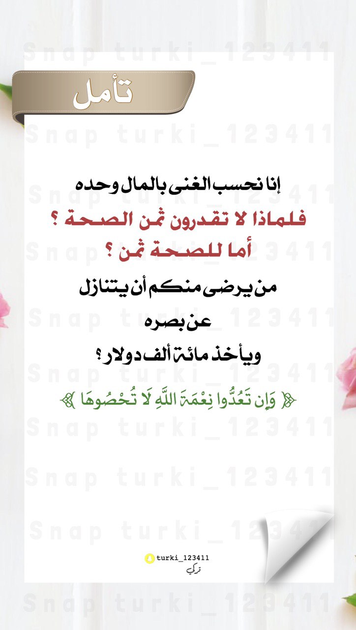 إنا نحسب الغني بالمال وحده فلماذا لا تقدرون ثمن الصحة ؟ أما للصحة ثمن ؟ من يرضى منكم أن يتنازل عن بصره ويأخذ مائة ألف دولار ؟