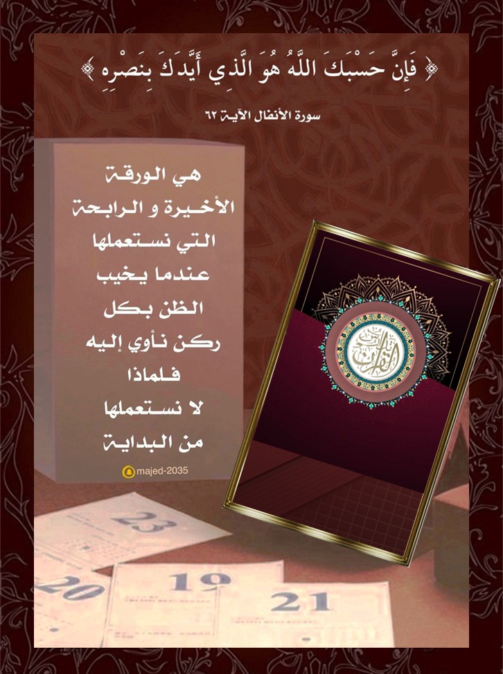 ﴿فَإِنَّ حَسْبَكَ اللَّهُ هُوَ الَّذِي أَيَّدَكَ بِنَصْرِهِ﴾ هي الورقة الأخيرة والرابحة التي نستعملها عندما يخيب الظن بكل ركنٍ نأوي إليه، فلماذا لا نستعملها من البداية.