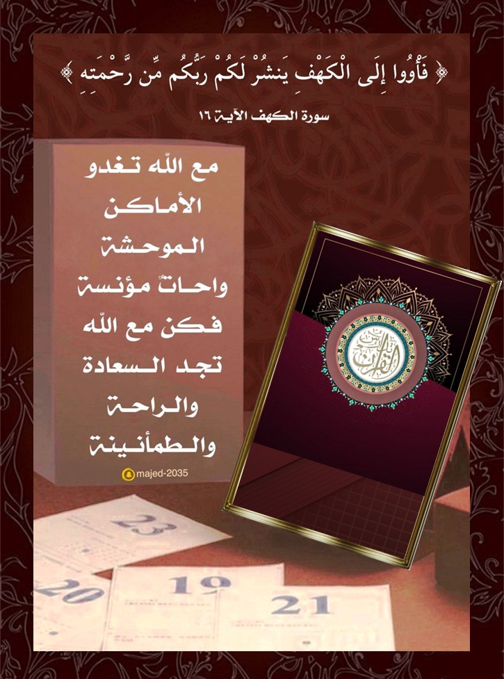 ﴿فَأْوُوا إِلَى الْكَهْفِ يَنشُرْ لَكُمْ رَبُّكُم مِّن رَّحْمَتِهِ﴾ مع اللهَ تغدو الأماكن الموحشة واحاتٌ مُؤنسة فكن مع الله تجد السعادة والراحة والطمأنينة.