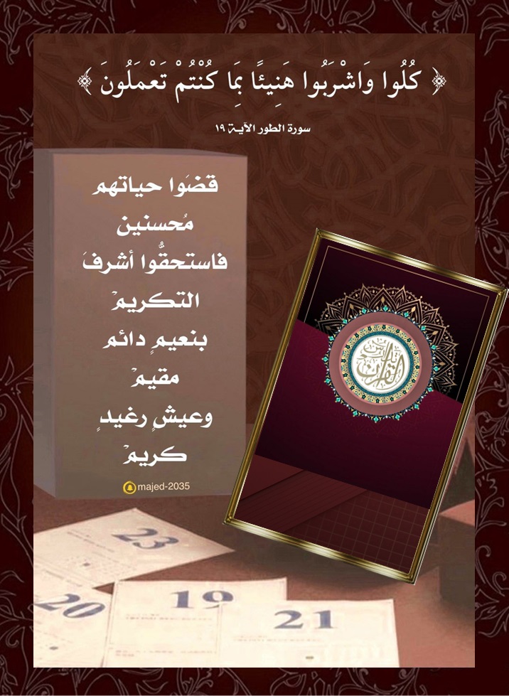 ﴿كُلُوا وَاشْرَبُوا هَنِيئًا بِمَا كُنتُمْ تَعْمَلُونَ﴾ قَضَوا حياتهم مُحسنين فاستحقُّوا أشرفَ التكريمْ بنعيمٍ دائم مقيمْ وعيشٍ رغيد كريمْ.