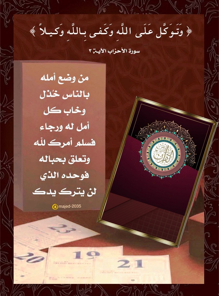 ﴿وَتَوَكَّلْ عَلَى اللَّهِ وَكَفَى بِاللَّهِ وَكِيلًا﴾ مَنْ وضع أملهُ بالناس خُذل وخاب كلُّ أملٍ له ورجاء، فسلم أمرك لله وتعلّق بحبالهِ فوحده الذي لن يترك يدك.