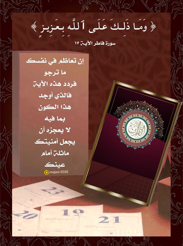 ﴿وَمَا ذَلِكَ عَلَى اللَّهِ بِعَزِيزٍ﴾ إن تعاظمَ في نفسك ما ترجو، فردد هذهِ الآيـة فالذي أوجد هذا الكون بما فيه لا يُعجزهُ أن يجعل أمنيتك ماثلةً أمام عينك.