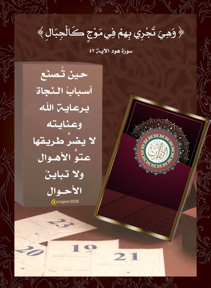 • ﴿وَهِيَ تَجْرِي بِهِمْ فِي مَوْجٍ كَالْجِبَالِ وَنَادَى نُوحٌ ابْنَهُ وَكَانَ فِي مَعْزِلٍ يَا بُنَيَّ ارْكَب مَّعَنَا وَلَا تَكُن مَّعَ الْكَافِرِينَ ﴿٤٢﴾    [هود   آية:٤٢]