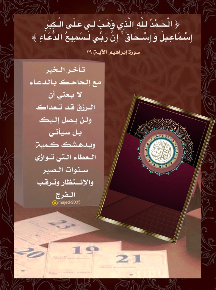 ﴿الْحَمْدُ لِلَّهِ الَّذِي وَهَبَ لِي عَلَى الْكِبَرِ إِسْمَاعِيلَ وَإِسْحَاقَ إِنَّ رَبِّي لَسَمِيعُ الدُّعَاءِ﴾ تأخر الخير معَ إلحاحك في الدعاء لا يعني أن الرزق قد تعداك ولن يصل إليك، بل سيأتي ويدهشك كمية العطاء التي توازي سنوات الصبر والإنتظار وترقب الفرج.