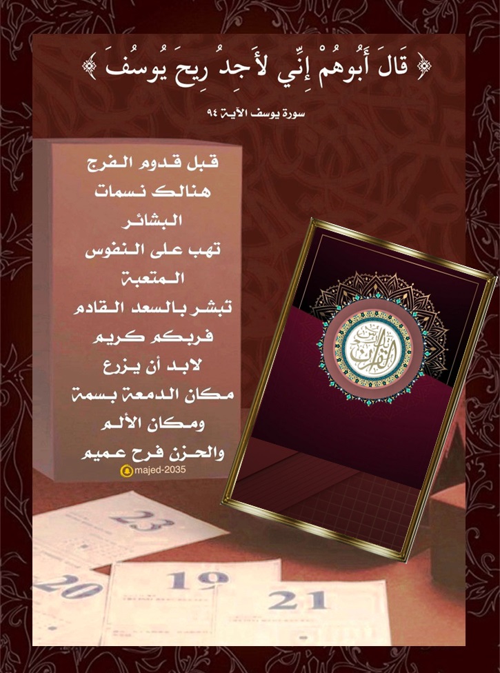 ﴿قَالَ أَبُوهُمْ إِنِّي لَأَجِدُ رِيحَ يُوسُفَ﴾ قبل قدوم الفرج هناك نسمات البشائر تهُب على النفوس المُتعبة، تُبشر بالسعد القادم، فربكم كريم لا بد أن يزرع مكان الدمعة بسمة ومكان الألم والحزن فرحٌ عميم.