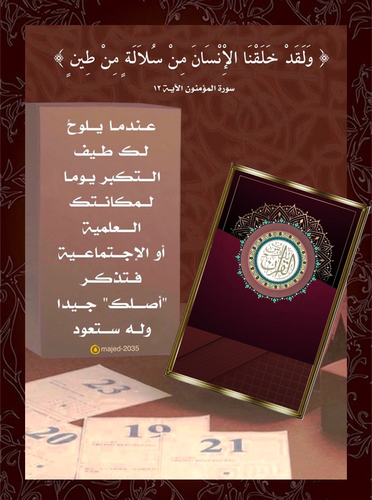 ﴿وَلَقَدْ خَلَقْنَا الْإِنسَانَ مِن سُلَالَةٍ مِّن طِينٍ﴾ عندما يلوحُ لك طيف التكبرُ يوماً لمكانتك العلمية أو الإجتماعية فتذكر أصلكَ جيداً ولهُ ستعود.