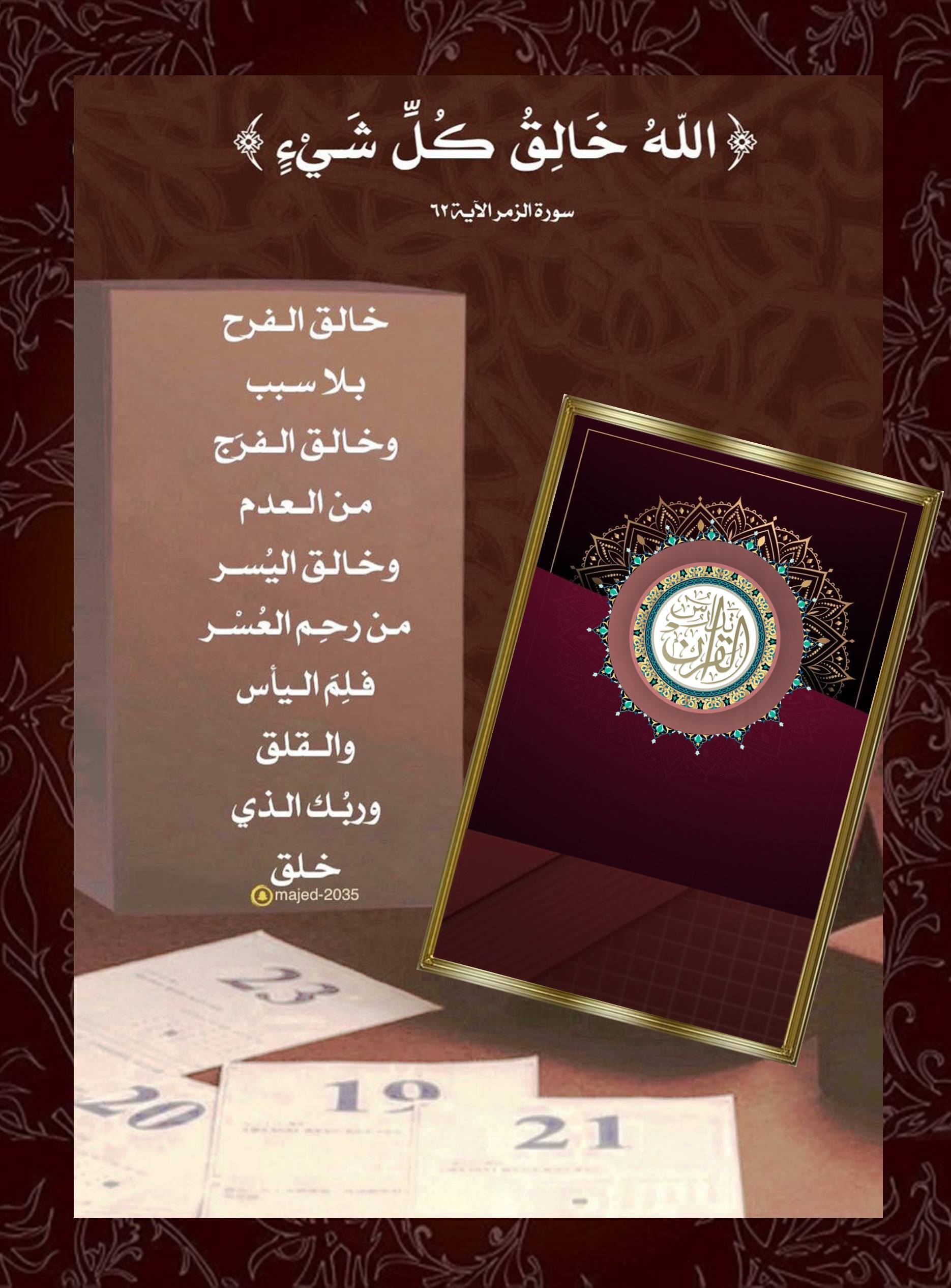 خالق الفرح؛ بلا سبب وخالق الفرَج؛ من العدم وخالق اليُسر؛ من رحِم العُسْر فلِمَ اليأس والقلق وربُك الذي خلق.